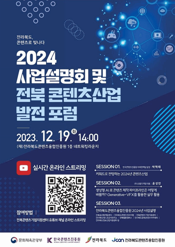 전북도민일보 | 2023-12-17 “K-콘텐츠 사업에 거침없이 도전하세요!” K-문화 콘텐츠가 전세계의 한류 문화( K-culture)를 선도하고 있는 가운데 (재)전라북도콘텐츠융합진흥원이 전북의 콘텐츠산업 발전방안 모색과 사업 지원에 발벗고 나섰다. 19일 오후2시 (재)전라북도콘텐츠융합진흥원 1층 네크워킹 라운지에서 ‘전라북도, 콘텐츠로 빛나다!’를 캐치프레이즈로 2024년 사업 설명회 및 전북 콘텐츠산업 발전 포럼을 개최한다. 대학이나 기업 기관등 도내 콘텐츠산업 종사자는 말할 것도 없고 콘텐츠 사업…